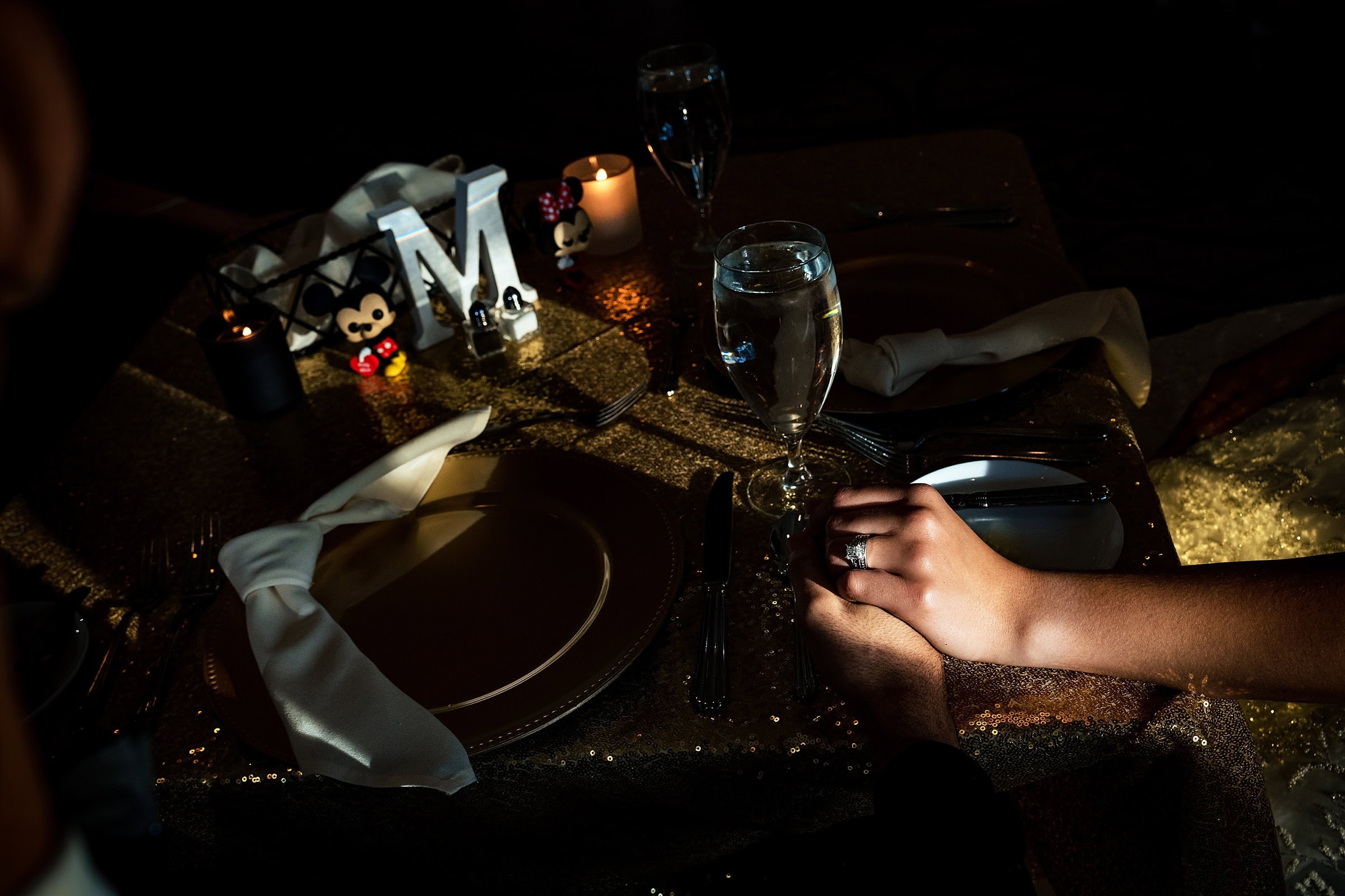 While Lauryn, Elliott, & I were braving the wind with their wedding party out on the cart paths, John was inside Brier Creek’s ballroom grabbing photos of these amazingly nerdy wedding details. Every table had a different theme with a Funko Pop display. I’m featuring Ahsoka and a Toy Story alien because I love them so, but there were superheroes, Harry Potter characters, Spongebob, Scooby Doo, professional sports mascots, and more. And we can’t forget Mickey & Minnie atop the cake. True Love!