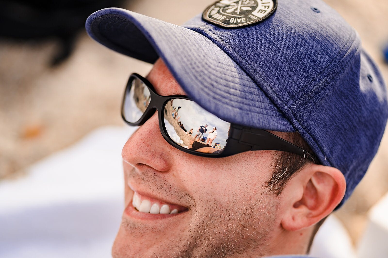 Bride wears a just married hat at the beach at her casual wedding reception