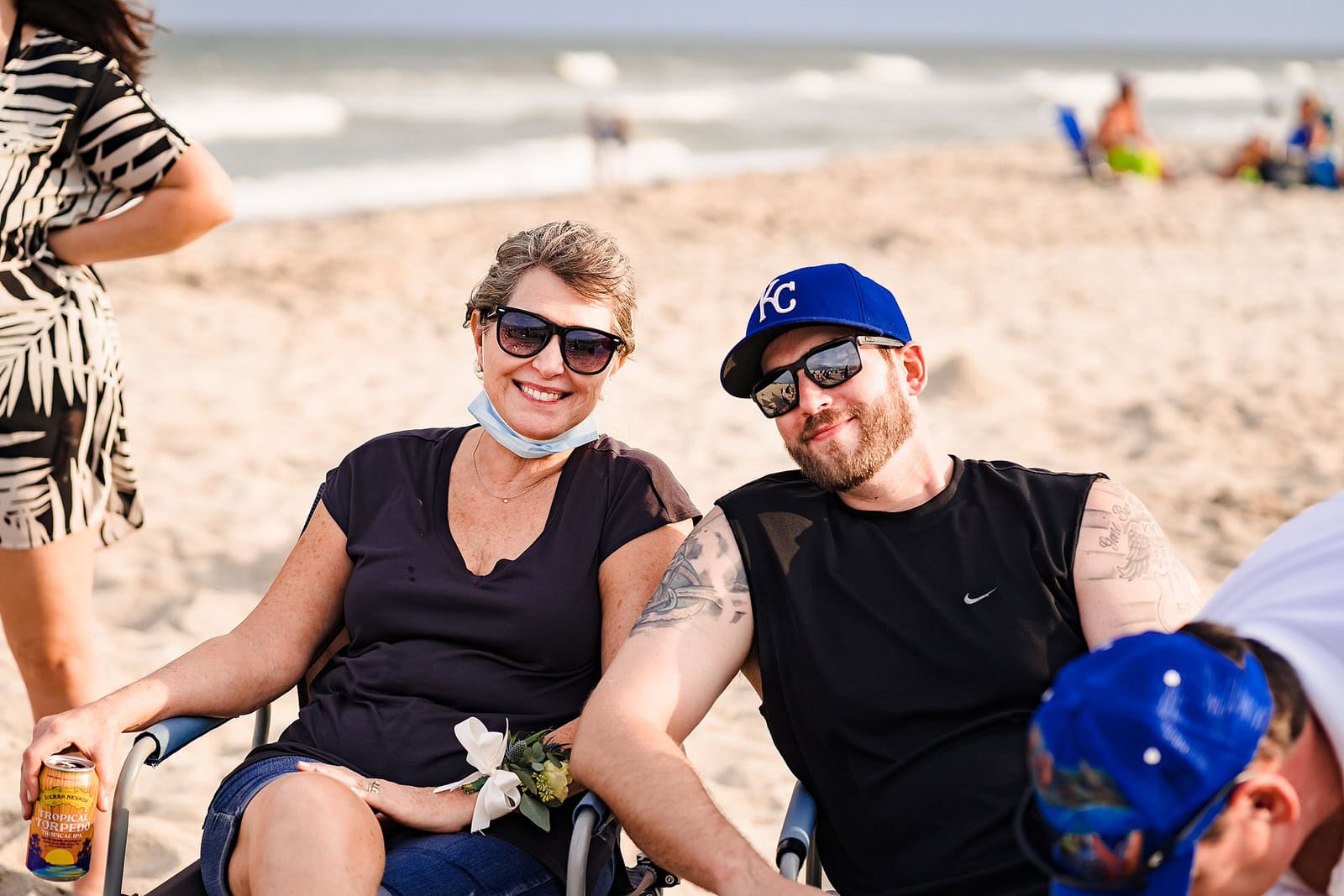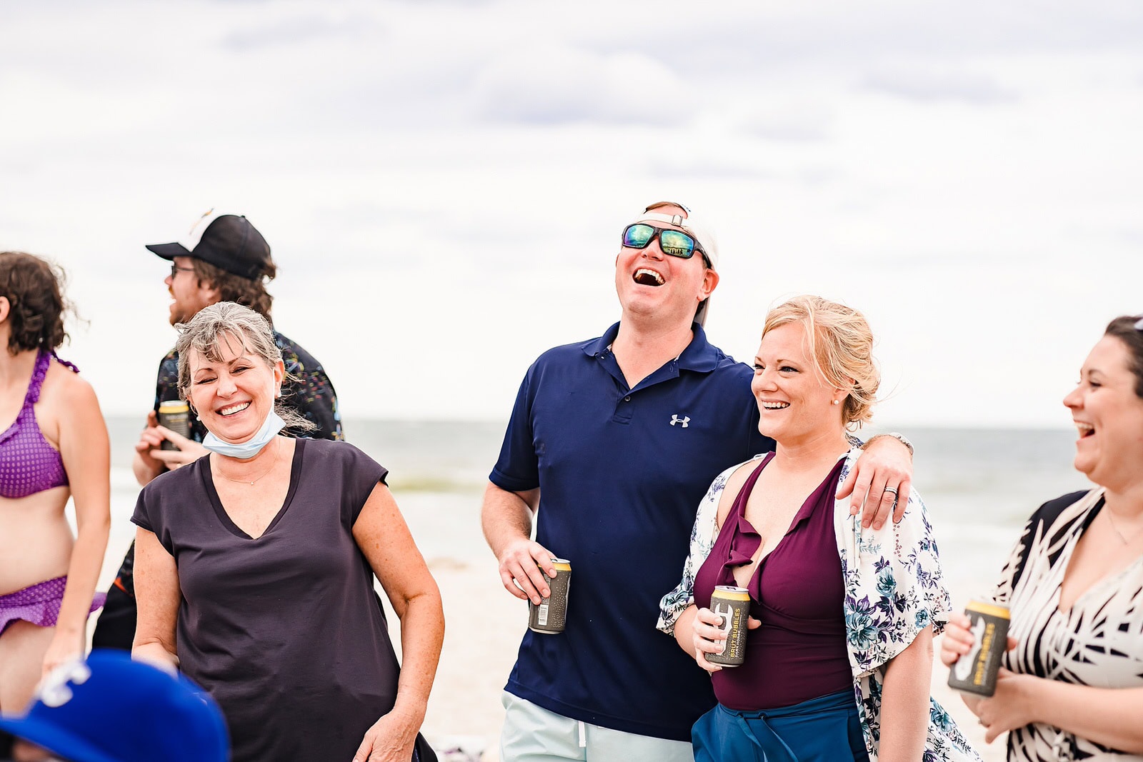 Groom and his friends shotgun beers at a casual beach wedding reception Bride and groom wear mr. and mrs. face masks at their casual beach wedding reception after their original plans were derailed due to Covid19