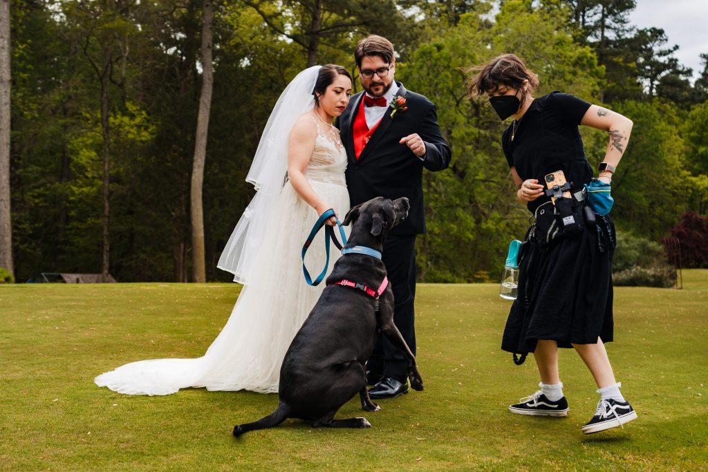 If they can’t handle being around the entire day, but you do want them for some photo opportunities, I recommend hiring a pet concierge for your bestie. Just one example is Dogs Like Ash. If you already have a trusted dog sitter/walker though, that’s a great place to start. Definitely have your pup’s handler bring their favorite toys/treats so we can keep their attention for photos. Christelle from Dogs Like Ash is below doing her thing.