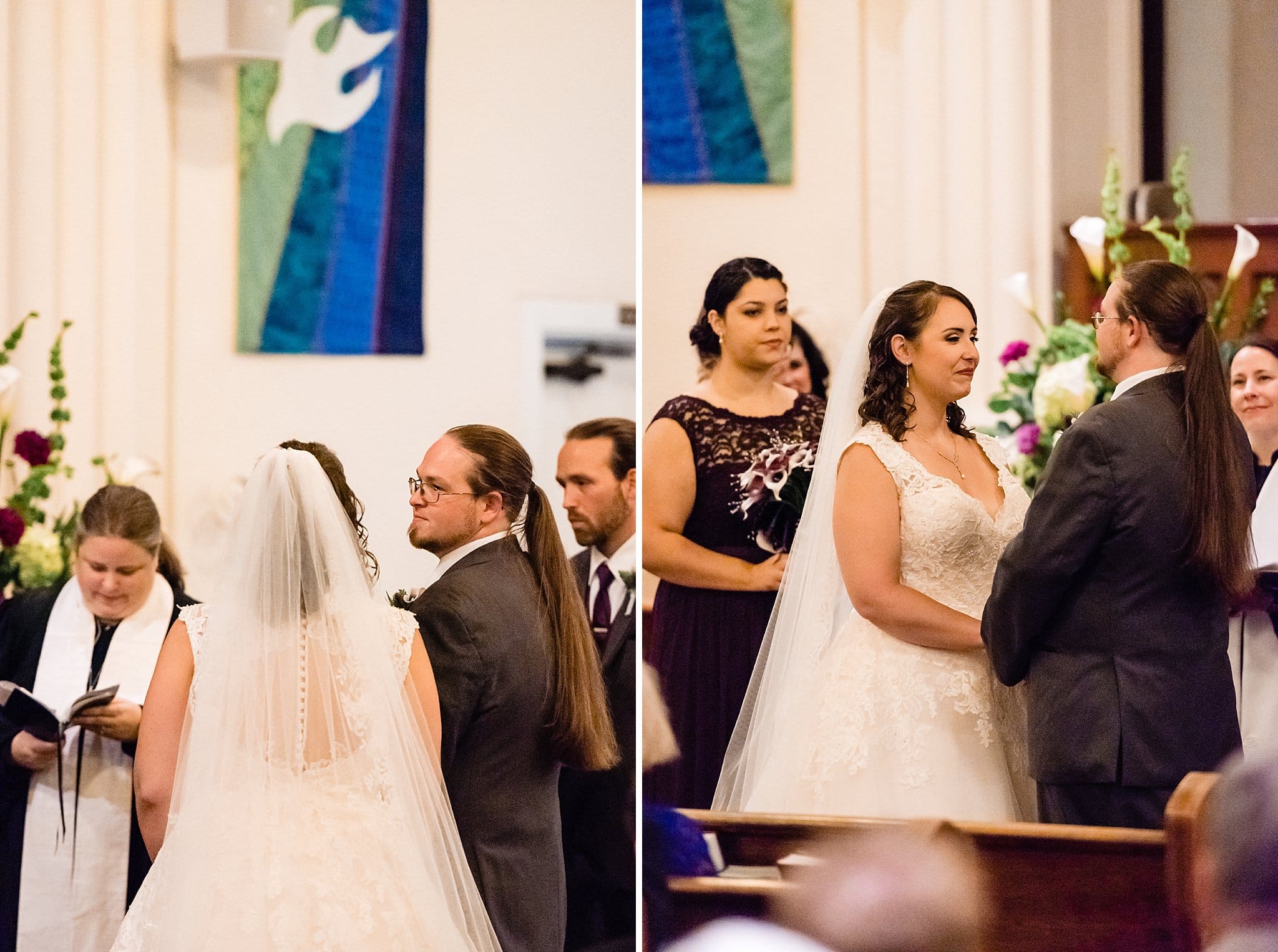 All purple everything at this downtown durham wedding, with a ceremony at Trinity Avenue Presbyterian and a reception in the heart of downtown at the Durham Armory.