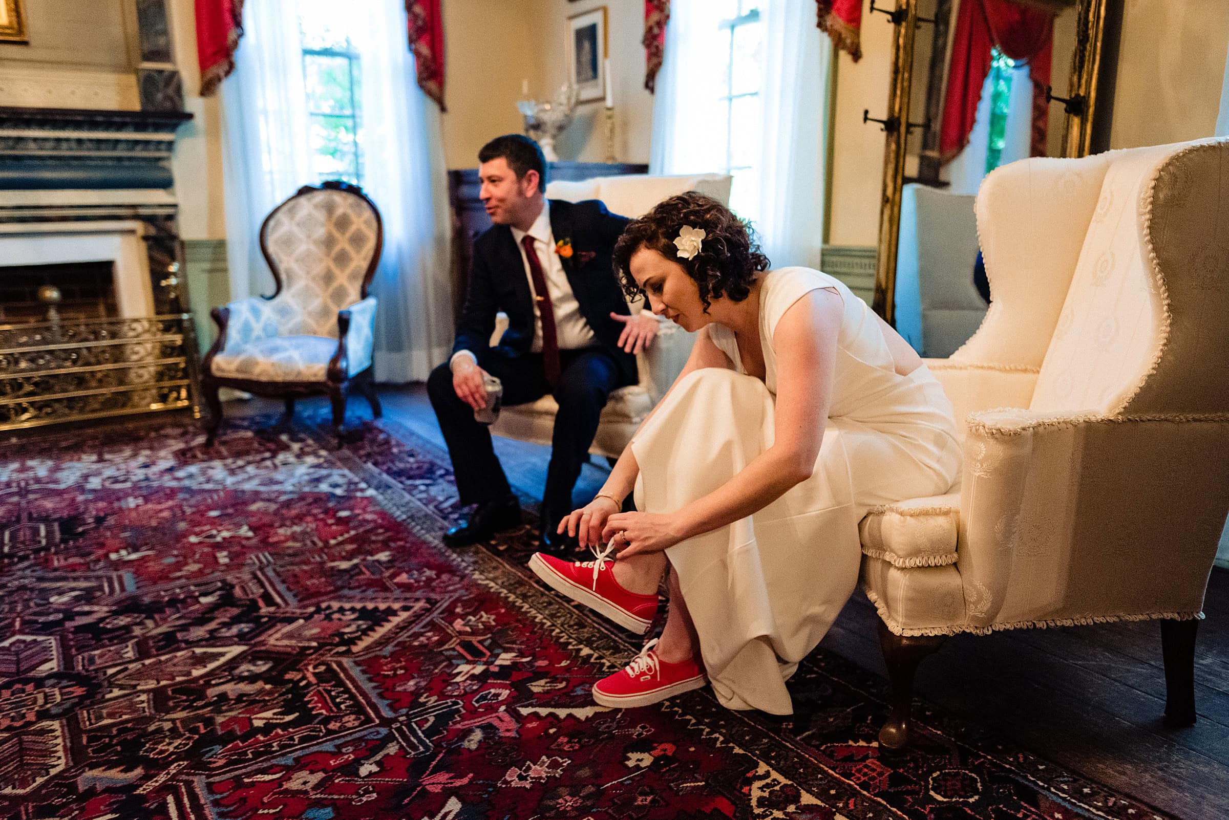 The theme of this Haywood Hall wedding was colorful florals and you know how much we love colors. There was also a cat toss*!!! And cat coozies. And the bride wore vans for part of the day. Basically it was magical and perfect and every detail suited these two, who knew within a couple months that they belonged together forever. Their ceremony included a reading from the Dalai Lama, a sing-a-long to a Fred Rogers song, and a tear and laughter inducing telling of their love story from their officiant Laney Margolis.