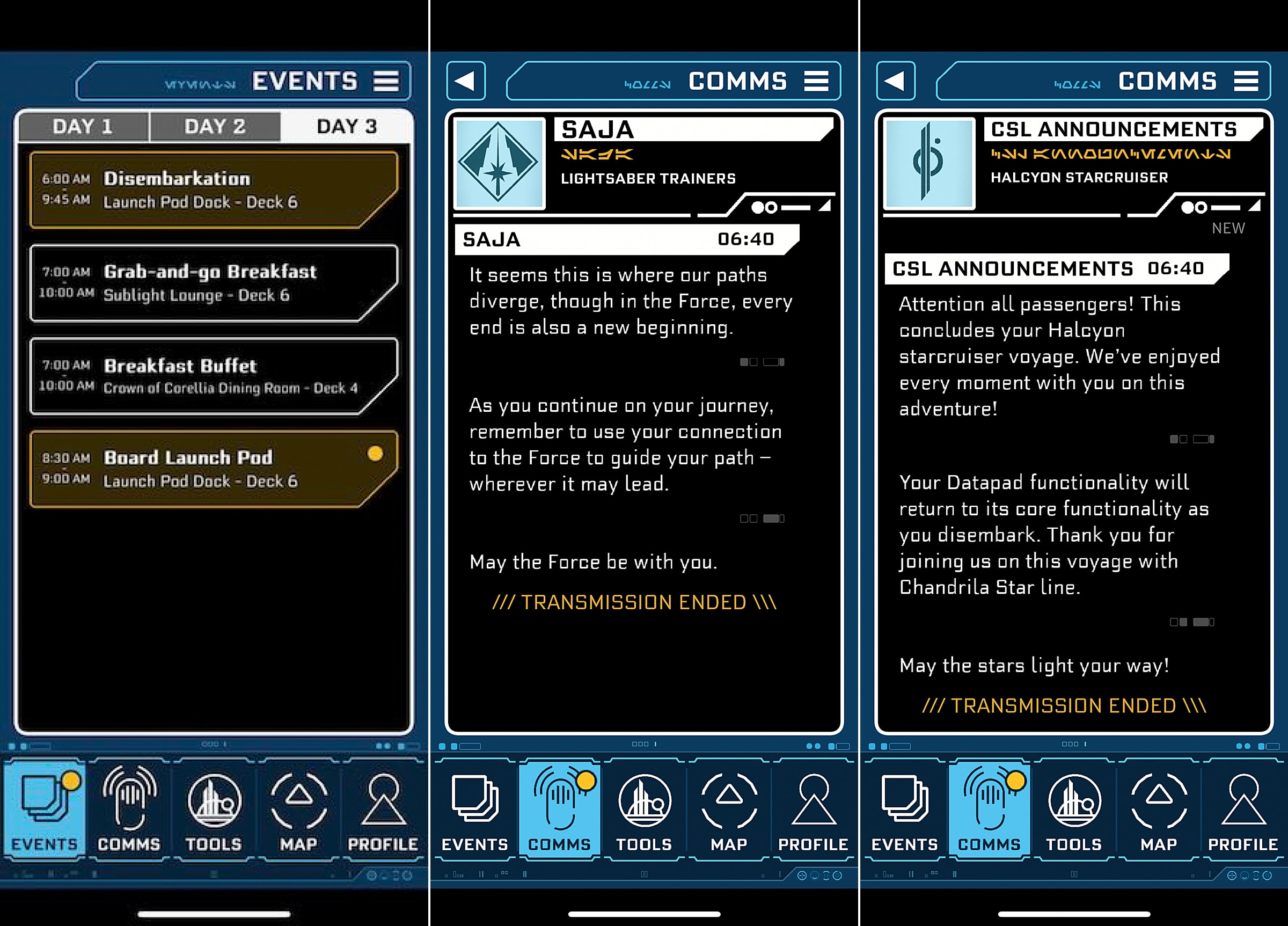 There are two different aspects to the game play on the Starcruiser: the app side, and the character interactions. They don’t necessarily sync up perfectly either, because the app doesn’t always know when you’ve spoken in person with a character, and the actors don’t know what you’ve been up to on your data pad.
