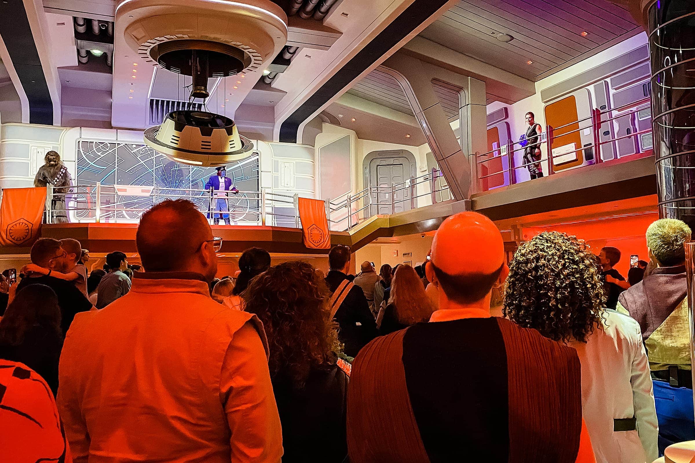 After some lunch, mingling, and a little bit of learning the data pad on our own, the next item on our agenda was the Captain’s Muster. All guests were called to the Atrium and assigned to muster stations (just a specific quadrant of the room). Captain Keevan and the cruise director Lenka Mok welcomed us and were about to propose a toast when Lt. Croy of the First Order showed up and explained that he was on board because the First Order believed the Halcyon to be harboring Resistance fighters. One of the ship’s mechanics, Sammie, was ordered to the engineering room to do something (I can’t remember exactly what) for the First Order.